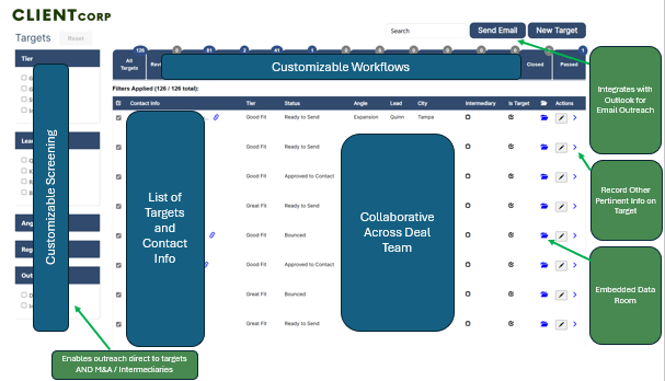 When you have a list of pre-screened potential targets who you’d like to engage in a deal, the tracking of these targets gets very cumbersome and unwieldy. Who has received an NDA? Who has submitted an NDA? Which ones are showing interest? Which ones are starting to fade? Which ones should we dis-engage? Who should be invited to the next phase? And what information have they reviewed? All of these stage gates are important to track and, of course, share with the client. Spreadsheets are easy to put together and can be shared but they only get you so far. Plus, they tend to create more chaos, potential for error and duplicative work.