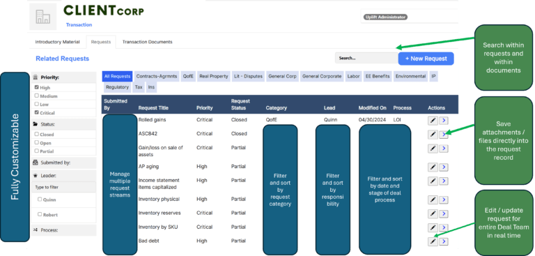 Our diligence platform is designed to keep track of every single request and attaches key information and content related to each as well. Additionally, our diligence platform similarly keeps track of all of the key documents associated with the transaction.